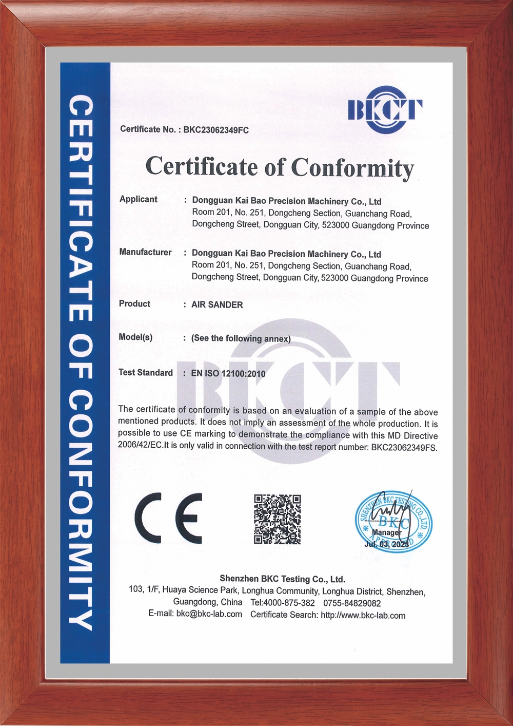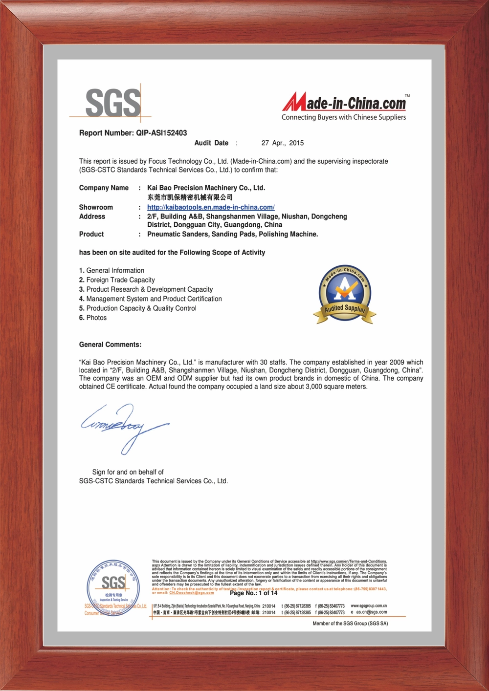 Dongguan Kaibao Precision Machinery Co, Ltd. was established in 2006. it mainly producs pneumatics sander, electric sander, air polisher, air anglgrinders, air die grinders, air belt sander, pneumaticscrewdrivers, backup pad, Hand grinder board and other air toosl .