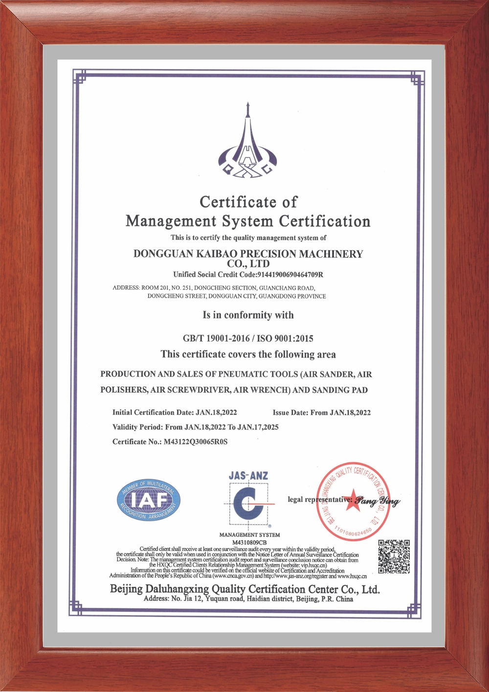 Dongguan Kaibao Precision Machinery Co, Ltd. was established in 2006. it mainly producs pneumatics sander, electric sander, air polisher, air anglgrinders, air die grinders, air belt sander, pneumaticscrewdrivers, backup pad, Hand grinder board and other air toosl .